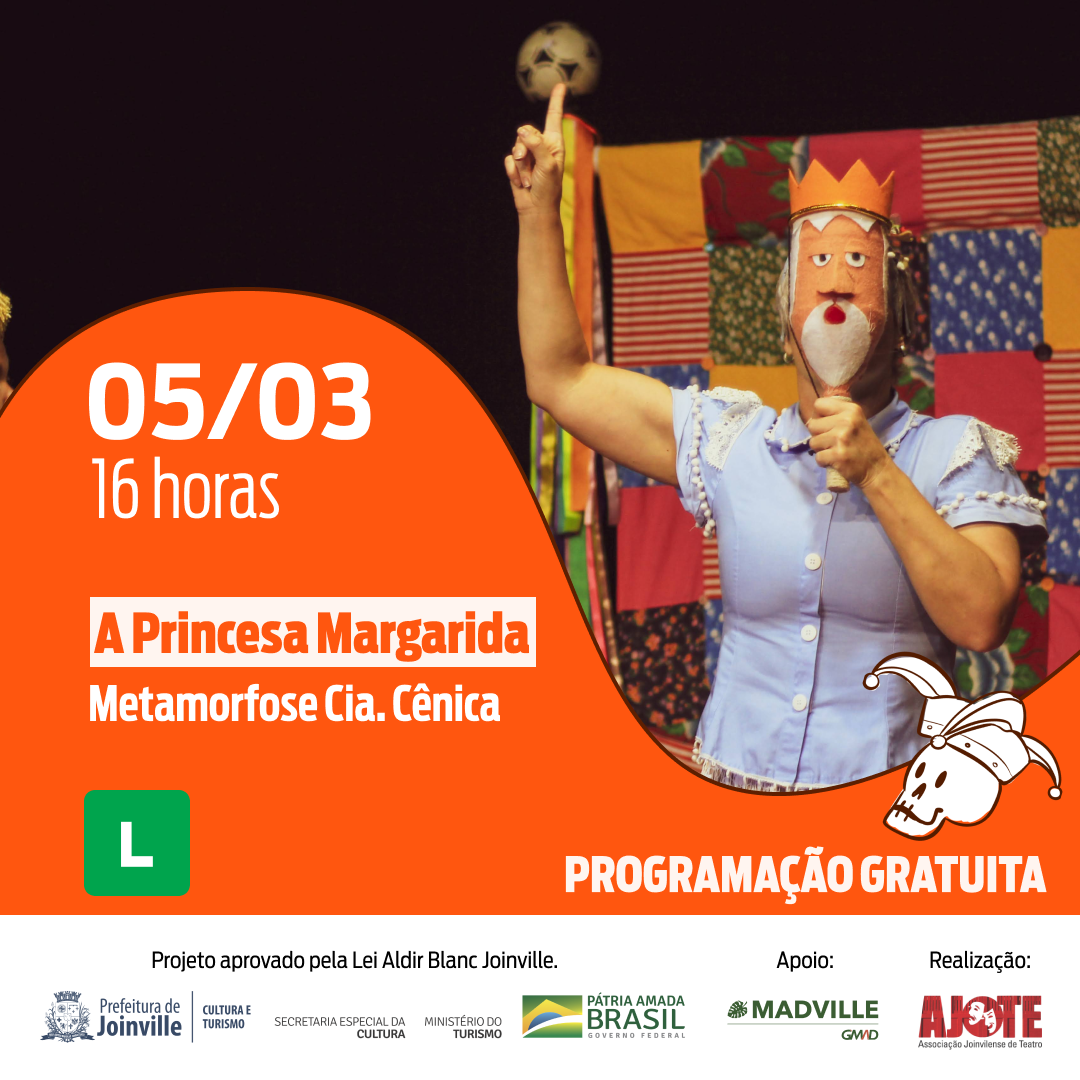 NOVA DATA: 21-04-2023 - SEXTA-FEIRA - 11h Em comemoração ao Creativity Day (Dia da Criatividade), a AJOTE promoverá nos dias 20 e 21 de abril atrações gratuitas para a comunidade, uma das atrações é o espetáculo “A Princesa Margarida” da Metamorfose Cia. Cênica. A Princesa Margarida desapareceu! O rei convoca a todos para que venham ajudar a encontrar a princesa. Onde está a Margarida?...