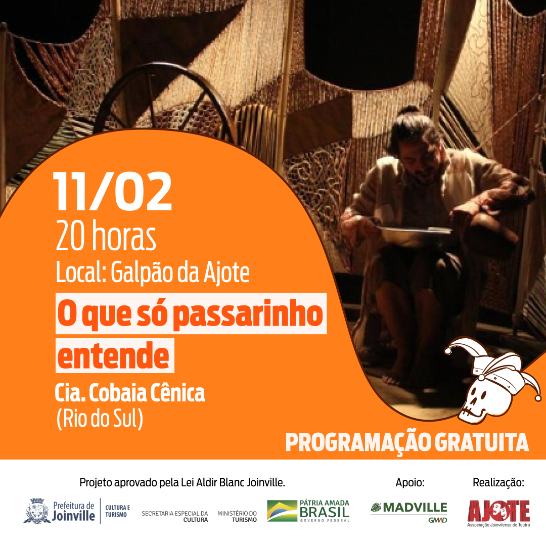 NOVA DATA: 11 a 14.11.2024 - 19h A mostra didática de Teatro da Escola Municipal de Teatro da Casa da Cultura, acontecerá de 11 a 28 de novembro de 2024, em três locais diferentes da cidade, sendo eles: Casa da Cultura, Galpão de Teatro da AJOTE, Teatro Juarez Machado e CEU - Centro de Artes e Esportes Unificados, do bairro Aventureiro...